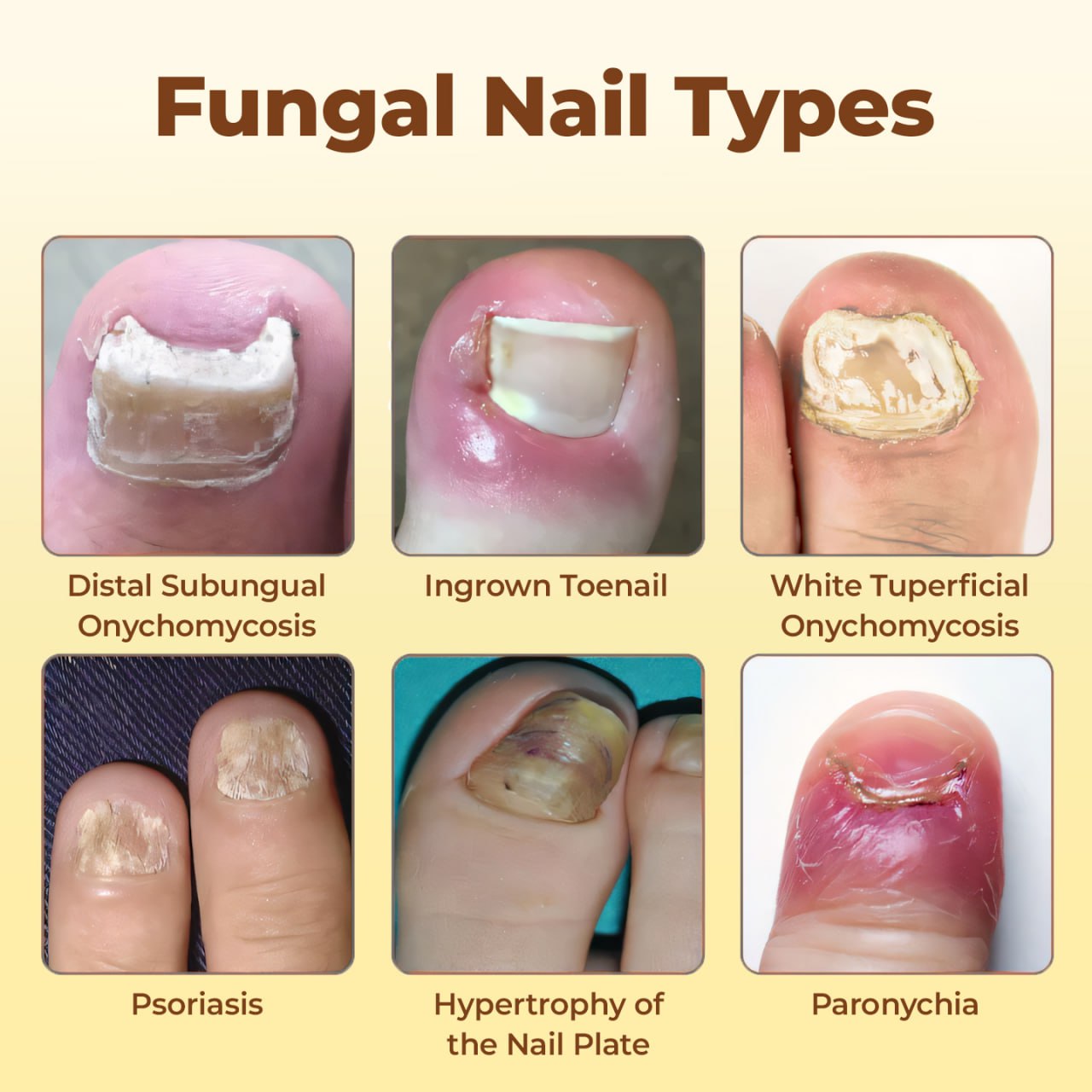 Nail fungus is a common and often persistent infection that affects the toenails or fingernails. The most noticeable signs include nails that are thickened, discolored (yellow, white, or brown), and brittle or crumbly. The surface of the nail may appear rough or flaky, and in severe cases, the nail can detach from the nail bed. Redness, swelling, pain, and an unpleasant odor are also common, especially if the infection spreads to the surrounding skin.