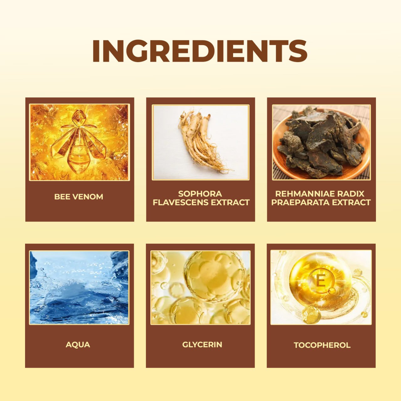 Rich in melittin and other bioactive peptides, bee venom provides powerful anti-inflammatory and antimicrobial properties. It helps reduce swelling, calms irritation, and aids in eliminating fungal pathogens at the source.